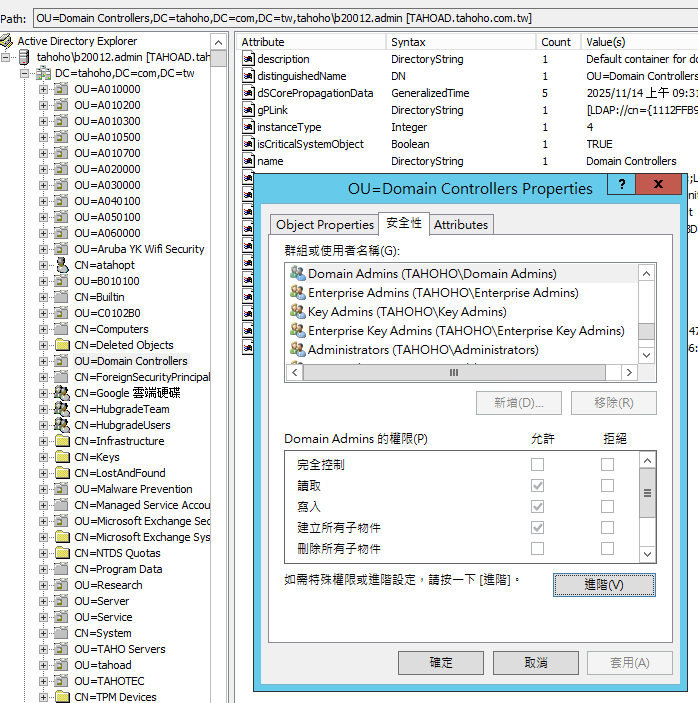 確認哪些帳戶或群組目前擁有修改「Domain Controllers」群組的權限。