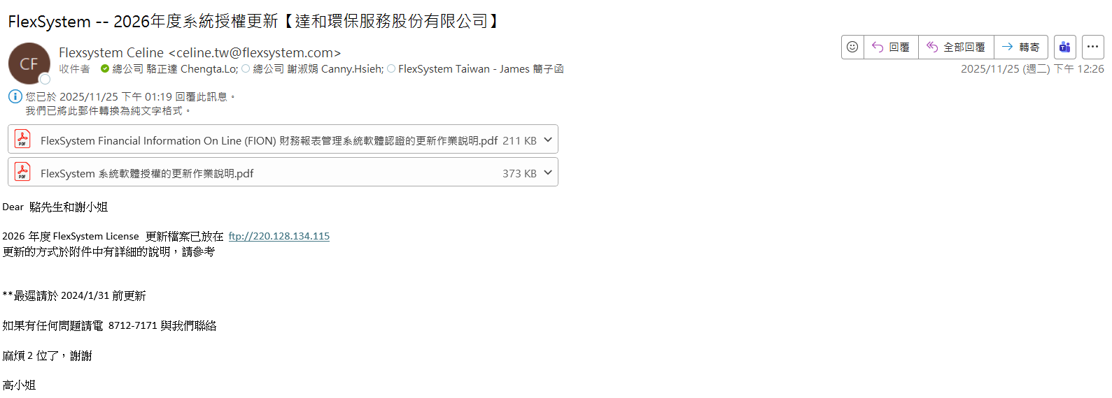 2026年度FlexSystem License 更新檔案已放在 ftp://220.128.134.115