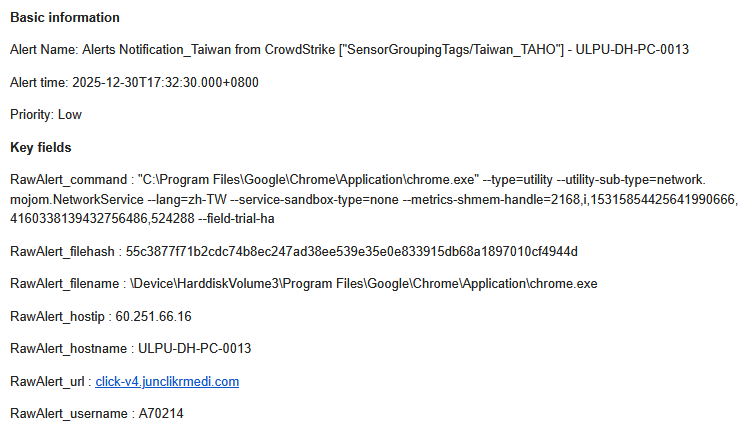 [INCCS-11231]-Low-Alerts Notification_Taiwan from CrowdStrike ["SensorGroupingTags/Taiwan_TAHO"] - ULPU-DH-PC-0013