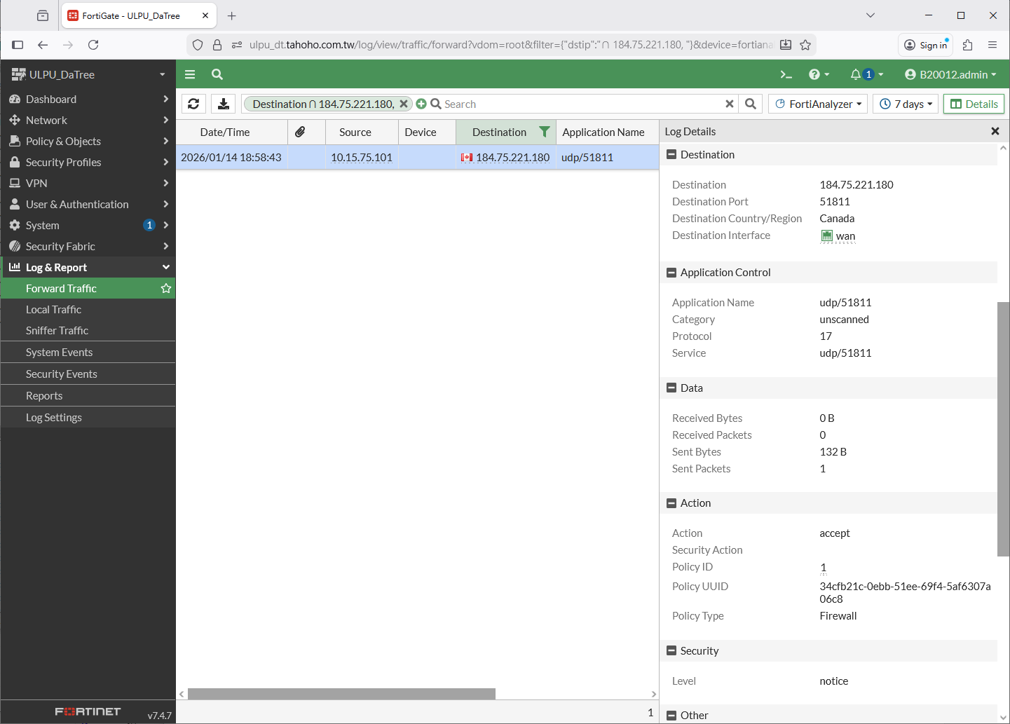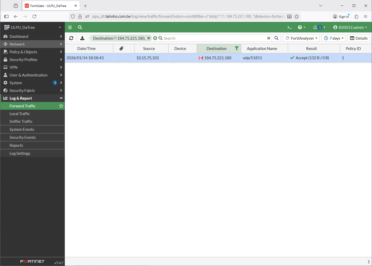 經查 7天內 對 184.75.221.180 有一筆記錄.