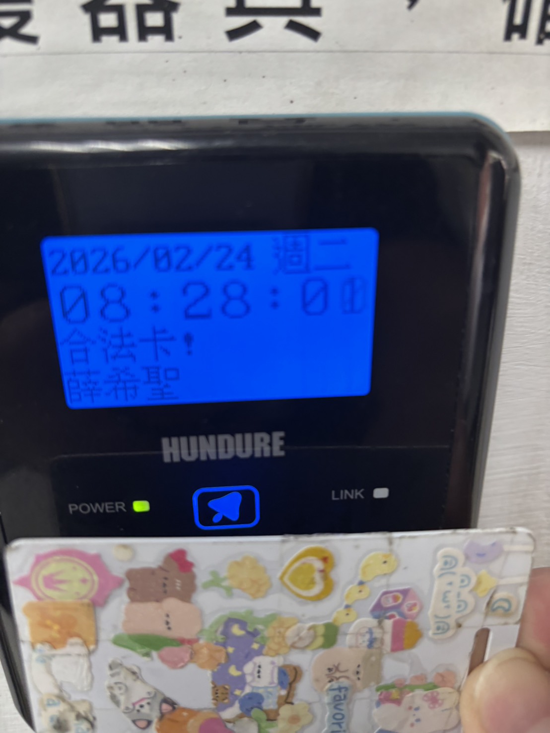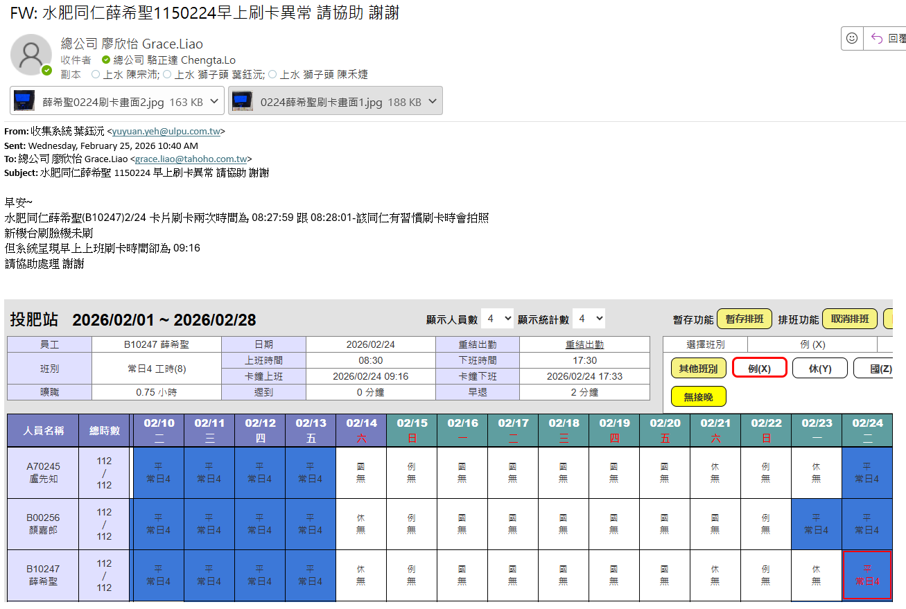 水肥同仁薛希聖(B10247)2/24卡片刷卡兩次時間為08:27:59跟08:28:01-該同仁有習慣刷卡時會拍照