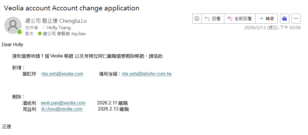 需要申請1個Veolia 帳號 以及有兩位同仁離職需要刪除帳號,請協助
