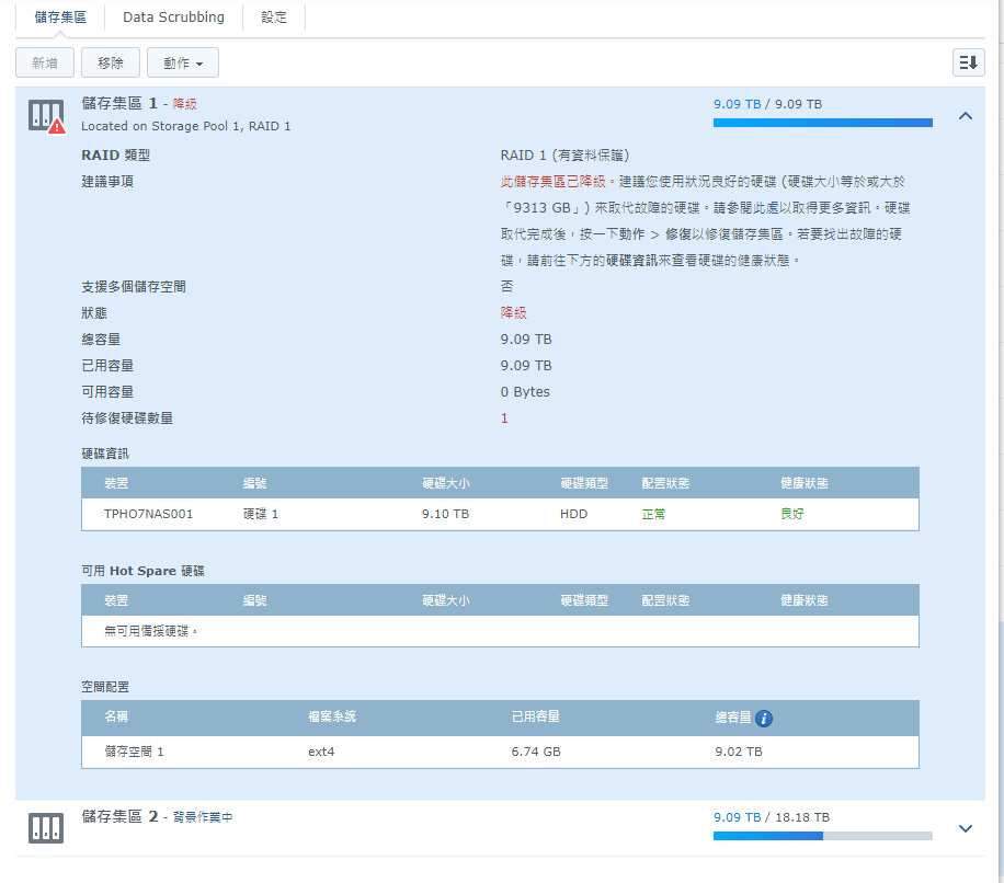 儲存集區2 硬碟 3,4 做RAID 1 互相保護。