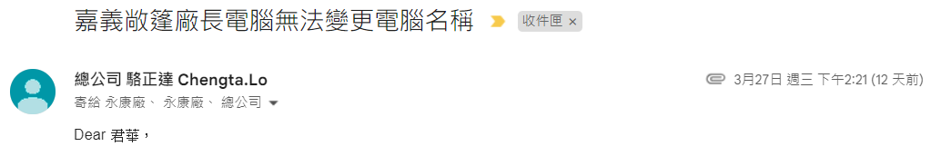 3/27 收到通知要求協助處理嘉義廠彭廠筆電事宜。